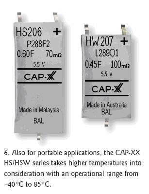 同樣針對緊湊空間設計但可耐更高溫度的CAP-XX公司HS和HW系列電容器具有很薄的外殼,工作溫度范圍是-40℃到85℃(圖6)。在4.5到5.5V電壓范圍內,HW的尺寸為28.5x17mm。在5.5V電壓時的電容量可達0.4F,ESR在5.5V時可低至100mΩ。