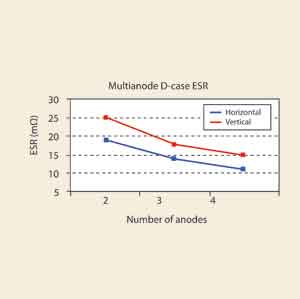 橫向和縱向結構兩者ESR性能之間的差異如圖2所示。這個例子是基于對D類電容器的理論計算,圖2表明,兩陽極橫向結構與三陽極系統的縱向結構的ESR值相似。然而,相對而言橫向結構在ESR上性價比優勢更顯著。