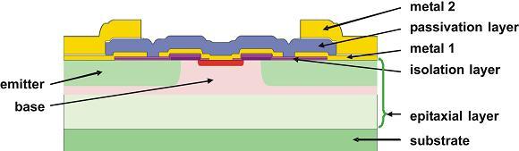 通過選擇不同的低電阻襯底,比如:圖1所示的摻磷/摻砷襯底,可以有效降低半導體中的電壓降比例。另一個重要的影響因素是電流分配,應在整個芯片范圍內(nèi)盡可能保持均衡,將芯片前端金屬化擴展電阻降至最低。對于BISS晶體管,芯片中的均衡電流分配通過一種稱為網(wǎng)格技術(shù)的手段來實現(xiàn)——將晶體管分成不同的格柵結(jié)構(gòu)。第四代BISS晶體管采用受專利保護的雙層金屬化布局,能夠最大程度提升發(fā)射極線路金屬厚度,降低飽和電阻(參見圖2)。