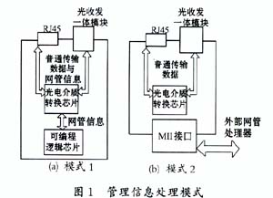 收發(fā)器網(wǎng)管功能的實(shí)現(xiàn)有兩種方式:一種是在收發(fā)器電路板上配置網(wǎng)絡(luò)管理信息處理器——可編程邏輯芯片來處理網(wǎng)管信息,該芯片利用OEMC上的雙向管理指令接口(Managenent Data Input/Output,MDIO)、管理數(shù)據(jù)同步時(shí)鐘輸入接口(ManagenentData Clock,MDC)及被管理信息輸入/輸出管腳等接口來獲取管理信息,管理信息與網(wǎng)路上的普通數(shù)據(jù)共用數(shù)據(jù)通道,如圖1(a)所示。第二種方式如圖1(b)所示,收發(fā)器上沒有管理信息處理器,收發(fā)器外部的網(wǎng)絡(luò)管理者通過MII接口獲取管理信息。可見,有網(wǎng)管功能的收發(fā)器,其元器件種類及數(shù)量遠(yuǎn)遠(yuǎn)多于無網(wǎng)管收發(fā)器,相應(yīng)地,其布線復(fù)雜,開發(fā)周期長。