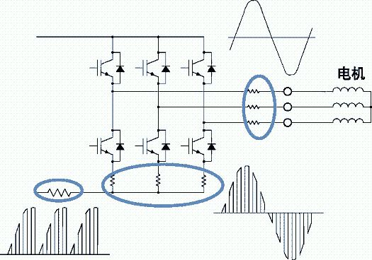實際上,電流信號可以通過與下列結(jié)點相連接而被取樣:正或負(fù)DC總線、單IGBT相位腳、或電機相位超前,如圖1所示。不管在哪個DC總線上取樣的電流信號,都是所有IGBT相位腳電流的矢量和。