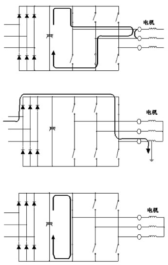 IGBT保護一般在硬件電路里實現(xiàn),根據(jù)要保護的過流條件的模式,具體電路和過流感測器件的類型會有所不同。其原因在于,在每個過流模式中的路徑和電流流動是不一樣的。圖3a至3c顯示了每個過流條件模式的典型電流流動,在主要功率電路里的電流流動及其路徑取決于過流的模式。在開關(guān)擊穿和線間短路條件下的短路電流總是流向直流總線上的電容器。然而,故障接地電流通常從交流線輸入,通過正直流總線和高側(cè)IGBT,流向故障發(fā)生的接地點。沒有電流流過總線電容器。