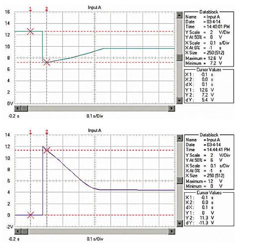 由于RM、RB、RL均非常低,啟動電流非常大。例如用12V、45Ah的蓄電池啟動安裝1.9升柴油機的汽車,蓄電池的電壓在啟動瞬間由12.6V降到約3.6V!啟動過程的蓄電池電壓波形如圖1;啟動瞬時的電流達550A,約為蓄電池的12C的放電率!啟動過程的蓄電池電流波形如圖2,(電流傳感器的電流/電壓變換比率:100A/V)。盡管車用蓄電池是啟動專用蓄電池,可以高倍率放電,但在圖1中可以看出,10倍以上的高倍率放電時的蓄電池性能變得很差,而且,如此高倍率放電對蓄電池的損傷也是非常明顯的。啟動過程的電壓劇烈變化也是極強的電磁干擾,可以造成電氣設備的“掉電”,迫使電氣設備在發電機啟動過程結束后重新上電,計算機在這個過程中非常容易死機。因此,無論從改善汽車電氣設備的電磁環境還是改善汽車的啟動性能和蓄電池的性能、延長使用壽命來考慮,改善汽車電源在啟動過程的性能是必要的。