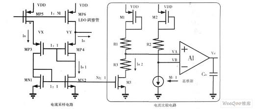 如圖1所示,電流采樣電路包括MP5、MP4、MP3、MN2和MN1。因?yàn)镸P5和MP6均工作在飽和區(qū),為了使MP5更好地等比例鏡像LDO的調(diào)整管(PMOS驅(qū)動(dòng)管)MP6的電流,特使用MN1、MN2、MP3和MP4組成自偏置的鏡像陣列,以保證VX=VY,Vds_p5=Vds_p6。所以根據(jù)飽和區(qū)電流公式得到,N1I_p5=N1Is=N1Is1=I_p6。為使M3電流與Is更好的匹配,根據(jù)經(jīng)驗(yàn)值并考慮功耗因素,特意將MN1、MN2和M3的過(guò)飽和電壓提高到0.3V。