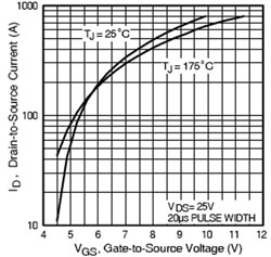 在MOSFET的數(shù)據(jù)表中,通常可以找到它的典型的傳輸特性。注意到25℃和175℃兩條曲線有一個交點,此交點對應(yīng)著相應(yīng)的VGS電壓和ID電流值。若稱這個交點的VGS為轉(zhuǎn)折電壓,可以看到:在VGS轉(zhuǎn)折電壓的左下部分曲線,VGS電壓一定時,溫度越高,所流過的電流越大,溫度和電流形成正反饋,即MOSFET的RDS(ON)為負(fù)溫度系數(shù),可以將這個區(qū)域稱為RDS(ON)的負(fù)溫度系數(shù)區(qū)域。