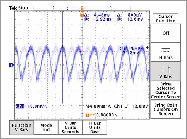 [page]經驗證明,抑制PLL雜散的有效途徑是合理的接地、電源布局和去耦技術,本文討論的布線原則是減小PLL雜散分量的良好設計開端。考慮到電荷泵中存在較大的電流變化,采用星形拓撲非常必要。如果沒有足夠的隔離,電流脈沖產生的噪聲會耦合到VCO電源,對VCO頻率進行調制,通常稱為“VCO牽引”。通過電源線間的物理間隔和每個VCC引腳的去耦電容、合理放置接地過孔、引入一個串聯的鐵氧體元件(作為最后一個手段)等措施可以提高隔離度。上述措施并不需要全部用在每個設計中,適當采用每種方式都會有效降低雜散幅度。圖9提供了一個由于不合理的VCO電源去耦方案所產生的結果,電源紋波表明正是電荷泵的開關效應導致電源線上的強干擾。值得慶幸的是,這種強干擾可以通過增加旁路電容得到有效抑制。圖10顯示的是在電路改變后,在同一點的測量結果。
