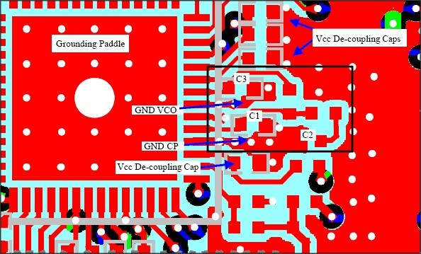 圖6.MAX2827參考設計板上PLL濾波器元件布置和接地示例