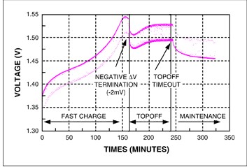 通常采用恒流源對NiMH電池充電。當達到充滿狀態時,會發生放熱化學反應,并導致電池溫度上升,電池端電壓降低??蓹z測電池溫度上升速率或者負向電壓變化率,并用來終止充電。這些充電終止方法分別稱為dT/dt和-ΔV。充電速率非常低時,dT/dt和-ΔV不太明顯,很難精確檢測到。電池開始進入過充狀態時,dT/dt和-ΔV響應開始顯現。此時如果繼續充電,將損壞電池。