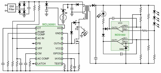 圖6 基于NCL30001 LED驅動器和NCS1002控制器的90 W LED驅動器演示板電路