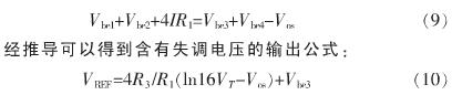 基準(zhǔn)源中運(yùn)放的設(shè)計(jì)是非常重要的,運(yùn)放的失調(diào)是基準(zhǔn)源的一個(gè)主要誤差源。由于不對稱性,運(yùn)放會(huì)受到輸入失調(diào)的影響。假設(shè)失調(diào)電壓為Vos,經(jīng)計(jì)算得到含失調(diào)電壓的輸出公式為: