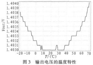 該電路的仿真基于Chartered 0.25 μm models。仿真軟件是T—SPICE,電源電壓為3.3 V,R3/R1的比值為2.306 6,這樣的結(jié)果在版圖設(shè)計(jì)中比較容易實(shí)現(xiàn),可以采用單元電阻串連的形式,有利于減少因?yàn)榘鎴D失配引起的誤差。單元電阻的W=3μm,L=10 μm,方塊電阻R=330 Ω,采用的第一層多晶實(shí)現(xiàn)。圖3所示的是輸出電壓溫度特性的仿真結(jié)果。