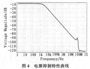 圖4是在1 Hz到10 GHz的范圍進(jìn)行掃描所得到的不同的電源抑制情況。低頻時(shí)抑制情況不太好,在-10 dB左右,還有待于提高;高頻抑制情況很好,基本穩(wěn)定在-120 dB左右。與傳統(tǒng)電路相比,本文提出的這種電路可以用于在各種系統(tǒng)尤其是高頻系統(tǒng)中,這一點(diǎn)是傳統(tǒng)電路所無法比擬的。