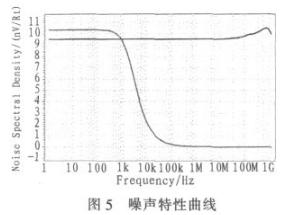 噪聲是影響帶隙基準(zhǔn)源穩(wěn)定性的主要因素之一。通常噪聲分為外部噪聲和內(nèi)部噪聲。外部噪聲一般都由電源電壓的變化以及其他電路的干擾造成。內(nèi)部噪聲主要包括熱噪聲和閃爍噪聲。閃爍噪聲的大小與頻率成反比,因而在低頻下主要為閃爍噪聲,而高頻下為熱噪聲,對于高頻的熱噪聲,可以在輸出端Vref處加一個(gè)RC低通濾波器解決掉,而低頻的來自耦合到電源的噪聲則是需考慮的,可以通過提高電源抑制比來減小。圖5為電路在輸出端和電源電壓處的噪聲特性,在輸出端低頻時(shí)噪聲為10.4 nv/Rt,高頻時(shí)噪聲幾乎為0 nv/Rt,性能很好。電源電壓處的噪聲為9.6nv/Rt左右。