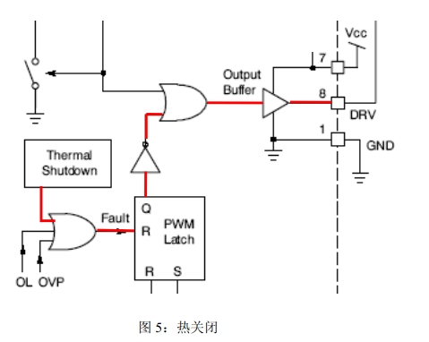 5.欠壓保護(UVP)/反饋環路異常保護:UVP可以防止在反饋故障條件下啟動。當VFB<8%VPREF=0.2V時,UVP激活,器件關閉;當VFB高于12%VPREF=0.3V時,器件自動開始工作。