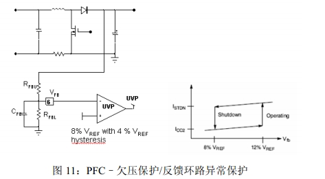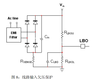 1.線路輸入欠壓(BO)保護:線路輸入欠壓引腳接收部分平均輸入電流,因此,感測到低線路電壓時,50ms定時器就會激活。這段消隱時間用于幫助符合維持要求。如果線路電壓在50ms消隱延遲結束時仍處于低電平,輸入欠壓保護就被觸發,PFC驅動器關閉,VCTRL引腳接地,可使器件在故障消失時使用軟啟動。