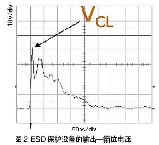 圖2所示的是一次ESD事件中,ESD保護設備的輸出(箝位電壓)。