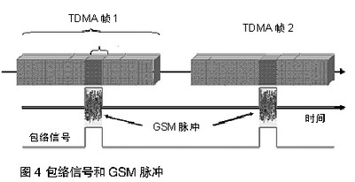 特定的手機只在屬于它的時間空當發(fā)射。包絡信號的基本頻率是1/4.615 ms=217Hz。諧波頻率為434Hz、651Hz等。如此頻率是聽得到的。如圖4所示,為手機的包絡信號。