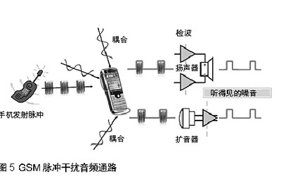 當手機與基站通訊,或兩個手機彼此接近時,發(fā)射脈沖通過擴音器,揚聲器,或頭戴式耳機線傳人音頻通路。見圖5。
