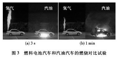 邁阿密大學的 MICHAEL[15]分別對燃料電池汽車和汽油汽車的燃燒進行對比試驗,將兩輛汽車分別用氫氣和汽油做燃料,然后做泄漏點火試驗,如圖 3 所示。點火 3 s 后,高壓氫氣產生的火焰直噴上方,而汽油由于比空氣重,則從汽車的下部著火。到 1 min 時,氫氣作燃料的汽車只有漏出的氫氣在燃燒,汽車沒有大問題; 而汽油車則早已成為一個大火球,完全燒光。這說明氫氣汽車比現在普遍使用的汽油車安全得多。