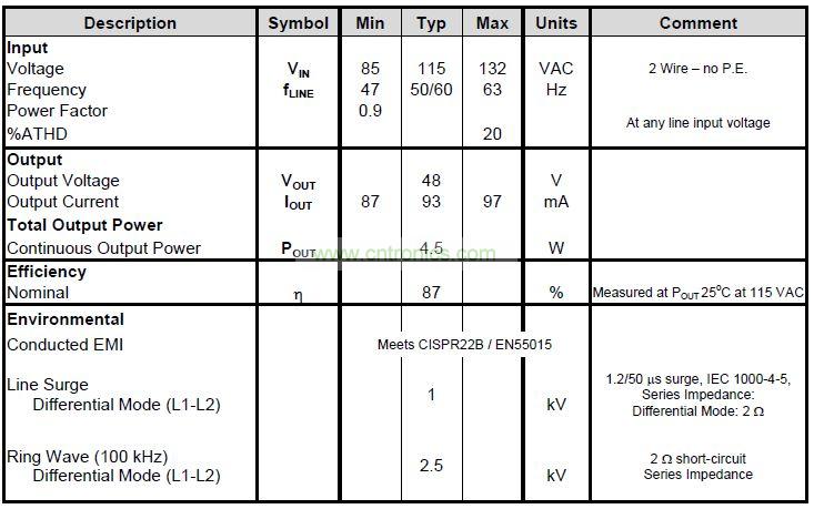 本文介紹采用PI LinkSwitch-PL系列非隔離單級LED驅動器IC設計而成的針對B10型LED燈泡設計的高效率、超緊湊驅動器——DER-297。它的單一恒流輸出功率為4.5W,可輕松配置從35V到100V的輸出電壓,如下表所示。