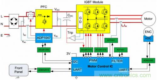 展示了柵極驅動、通信和反饋信號隔離的典型驅動電路如圖4所示。在該系統(tǒng)中,隔離的Σ-Δ ADC用來測量電機繞組電流,數(shù)字位流則由電機控制IC上的數(shù)字過濾電路進行處理。位置編碼器包含一個ASIC,由其通過一個隔離式RS-485接口將位置和速度數(shù)據(jù)發(fā)送給電機控制IC。其他隔離式串行接口包括連接PFC的I2C接口以及連接前面板的隔離式RS-232鏈路。在此例中,PWM信號與逆變器模塊隔離,IGBT由一個嵌入該模塊中的電平轉換柵極驅動器驅動。