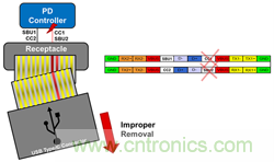新型USB Type-C連接器除了用于USB Type A或Micro-USB連接器的標準靜電放電(ESD)保護外,還具有挑戰性的保護考慮。由于USB Type-C連接器的管腳間距如此之小,因此可能會將高電壓VBUS電源管腳短路到附近的數據管腳。而且由于通過VBUS電源傳送(PD),VBUS電源管腳可達到20V,5A,因此將VBUS短路到配置通道(CC)或邊帶使用(SBU)管腳對下游PD控制器來講將是災難性的,因為PD控制器并不能處理這些管腳上的較高電壓(圖1)。
