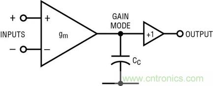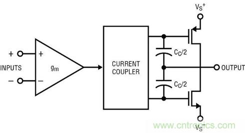 圖 1a 顯示了一個非軌至軌放大器的方框圖。輸入控制 gm 方框,gm 方框驅(qū)動增益節(jié)點,并在輸出端得到緩沖。補償電容器 Cc 是主要的頻率響應(yīng)組件。Cc 的返回引腳應(yīng)該接地,如果有這樣一個引腳的話;但是運算放大器傳統(tǒng)上不接地,電容器電流會返回一個或兩個電源。圖 1b 是最簡單的軌至軌輸出放大器的方框圖。輸入方框 gm 的輸出電流通過“電流耦合器”發(fā)送,這將驅(qū)動電流分成兩部分,提供給輸出晶體管。頻率響應(yīng)由兩個 Cc/2s 決定,二者實際上是并聯(lián)的。