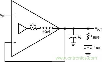 防止負(fù)載電容引起振蕩的最常見方式是,在反饋連接之后,簡單地給電容串聯(lián)一個小阻值的電阻器。10Ω 至 50Ω 的阻值將限制容性負(fù)載可能引起的相位滯后,并在速度非常高的時候,隔離放大器和低容性阻抗。缺點包括隨負(fù)載電阻特性而變化的 DC 和低頻誤差、容性負(fù)載頻率響應(yīng)受到限制、以及如果負(fù)載電容在電壓變化時不恒定所導(dǎo)致的信號失真。