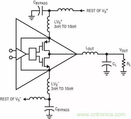 最后一個需要考慮的振蕩源是電源旁路。圖 10 顯示了輸出電路的一部分。LVS+ 和 LVS– 是不可避免的封裝、IC 接合線、旁路電容器的物理長度 (像任何導(dǎo)體一樣也是電感性的) 以及電路板走線的串聯(lián)電感。還包括將局部旁路組件連接到電源總線其余部分 (如果不是電源平面) 的外部電感。盡管 3nH 至 10nH 看起來似乎不大,但是在 200MHz 時,就是 3.8 至 j12Ω。如果輸出晶體管傳導(dǎo)大的高頻輸出電流,那么在電源電感兩端會存在壓降。