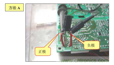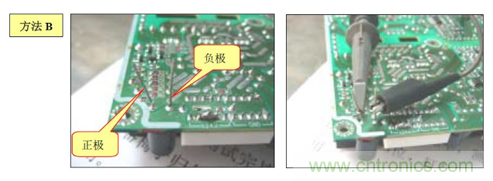 B. 方法(2):在電源板的錫面找出待測電容正負(fù)極對應(yīng)的焊點(diǎn),焊上兩根導(dǎo)線,然后用電壓探頭夾住引出的導(dǎo)線測試.如下圖: