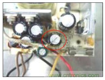 A.當(dāng)電路板上電容所在的位置周圍沒有裝有發(fā)熱器件時,直接將溫度感應(yīng)探測端接于電容頂部鋁殼上, 溫度感應(yīng)探測線另一端連接點(diǎn)溫機(jī),如下圖: