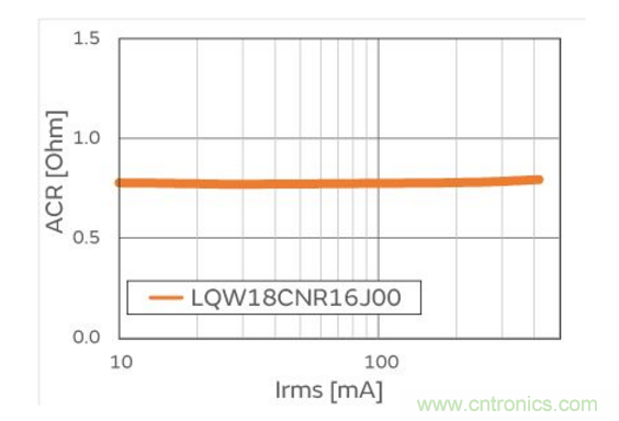 由于電感器的電流值發(fā)生變化,電感值也會發(fā)生變化。如圖2所示,LQW18CN系列對于AC電流的電感值依存性非常小。因此,即使NFC電路流通的AC電流變大,特性也不會發(fā)生很大變化。此外,如圖3 所示,即使是大電流也能保持低ACR。
