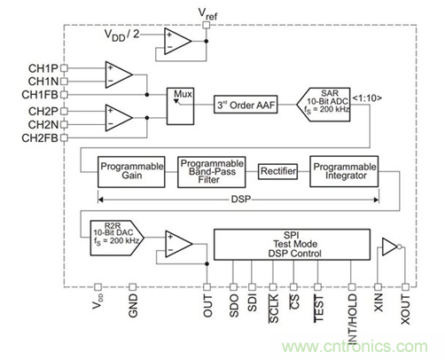 表 2 顯示了各種頻率輸入信號的輸出信號振幅的測試數(shù)據(jù)。 已對每個器件的帶通濾波器進行編程,使其具有 6.94kHz 的中心頻率,因此應(yīng)抑制遠離該中心頻率的輸入信號。