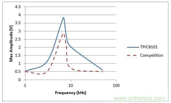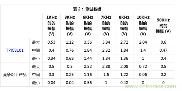 圖 2 顯示了表 1 中的結(jié)果。 噪聲等級 () 在兩個器件之間大概是相同的,因為遠離中心頻率的振幅基本相同。 在中心頻率,TPIC8101 具有更高的振幅,這意味著其 SNR 要優(yōu)于競爭產(chǎn)品。