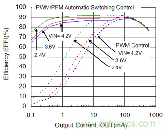 圖3 PFM控制和PWM控制自動(dòng)轉(zhuǎn)換波形(負(fù)載電流:1mA⇔100mA)