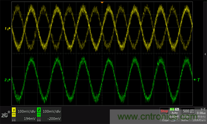 圖5 CH1不開啟高頻抑制觸發不穩、CH2開啟高頻抑制