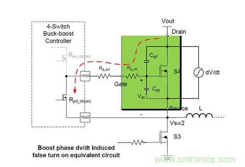 然后,這一問題在4開關降壓-升壓轉換器中翻了一番,因為它有兩個階段——降壓和升壓。當設計人員直接將降壓轉換器的電路參數復制到4開關降壓-升壓轉換器的升壓段時,就會產生錯誤。隨著這種拓撲結構在應用中越來越受歡迎,了解dv/dt電感導通問題變得越來越重要。