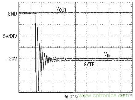 圖 3 示出了當(dāng) VIN 帶電插入至 –20V 時(shí)出現(xiàn)的狀況。 在連接的前一刻, VIN 、VOUT 和 GATE 以地電位為起始點(diǎn)。由于 VIN 和 GATE 連接線的寄生電感之原 因, VIN 和 GATE 引腳上的電壓將顯著地變至 –20V以下。外部 MOSFET 必須具有一個(gè)可安全承受該過沖的擊穿電壓指標(biāo)。