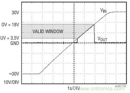 圖 2 示出了圖 1 電路中的 VIN 從 –30V 緩慢斜坡上升 至 30V 時(shí)做出的反應(yīng)。UV 和 OV 門限被分別設(shè)定為 3.5V 和 18V。當(dāng)電源電壓位于 3.5V 至 18V 窗口之內(nèi) 時(shí), VOUT 跟隨 VIN 。若超出該窗口時(shí),LTC4365 將 關(guān)斷 N 溝道 MOSFET,并使 VOUT 與 VIN 斷接,即使 在 VIN 為負(fù)值的情況下也不例外。