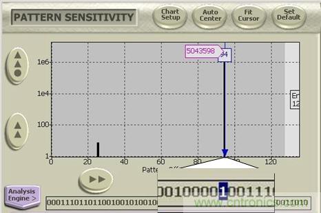 在客戶進行誤碼測試的時候,由于鏈路的損耗和芯片的輸出特性,導(dǎo)致出現(xiàn)了誤碼,但客戶卻想知道究竟是哪一個bit位出現(xiàn)了誤碼,以定位誤碼出現(xiàn)的根源。設(shè)置Bert的輸出/輸入端設(shè)置為PRBS7的碼型,在誤碼分析功能里面選擇Patten Sensitivity,則可以直接觀察PRBS7的127個比特的每一位所出現(xiàn)誤碼的個數(shù),看最多誤碼所對應(yīng)的比特位的前后特性,如下圖十三,移動光標(biāo)到任意一個比特上面,可以看到連續(xù)多個0而中間有一個1跳變的bit即127比特的第94比特出現(xiàn)誤碼的個數(shù)最多,達到5043598個誤碼。從而判斷由于鏈路ISI的影響導(dǎo)致突然的跳變位出現(xiàn)較高的誤碼率。