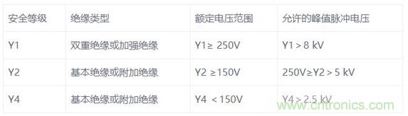 我們都知道Y電容是安規電容,是跨接L線地以及N線與地之間的電容,它的作用是抑制共模干擾?,F在一共有三種等級,分別是是Y1, Y2, Y4。由于漏電流不能太大這是安規要求,漏電流太大人體觸摸用電器會有一種麻麻的感覺,因此一般Y電容容量大小為1nF到4.7nF之間。