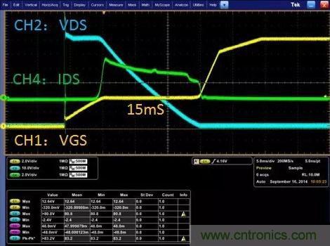 在電池保持板PCM過流關斷的過程中,從波形可以看到:功率MOSFET同樣也有較長的一段時間工作于線性區。