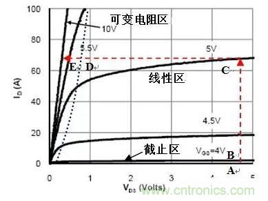 功率MOSFET也有三個工作狀態,在漏極導通特性曲線上,對應的是三個工作區:截止區,線性區和可變電阻區。如圖10所示。注意到:MOSFET的線性區有時也稱為:恒流區或飽和區。