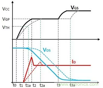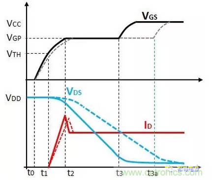 階段3(t2-t3)為米勒平臺,VGS電壓保持米勒平臺電壓VGP,整個過程中,VDS電壓逐漸下降到低的電壓值,ID電流保持不變。