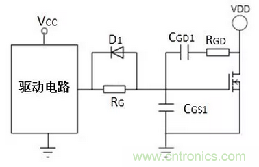 完整的外圍電路,包括G極電阻總和RG,RG并聯快關斷二極管D1,功率MOSFET的G、S外加電容CGS1,G、D外加電容CGD1和電阻RGD,如圖7所示,其中RG為G極電阻總和,包括功率MOSFET內部電阻、驅動芯片上拉電阻和外加串聯電阻RG1。