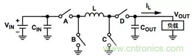 在降壓模式下, 降壓-升壓轉換器工作如下圖,Vin大于Vout時,開關C打開,開關D閉合。
