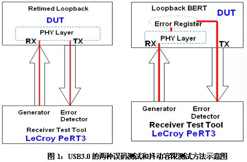 對于USB3.0的接收機(jī)測試還可以使用另一種方法:即Loopback BERT Method。如下圖1的右圖所示:DUT的接收端工作在Loopback BERT模式,直接分析BERT發(fā)送出的已知的測試碼流,對接收到的誤碼計(jì)數(shù),誤碼數(shù)量存入誤碼寄存器(如下圖1的Error Register),LeCroy PeRT3直接讀取誤碼寄存器,得到誤碼率和抖動(dòng)容限測試結(jié)果。