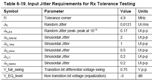 在接收機(jī)測試中,碼型發(fā)生器和待測試芯片的擴(kuò)頻時(shí)鐘功能(SSC)都打開,輸出信號的特征需滿足下圖3所示:信號的峰峰值大于750毫伏,-3dB的去加重,隨機(jī)抖動(dòng)的RMS值為0.0121UI(Unit Interval的簡稱,即1個(gè)比特的時(shí)間),即0.0121*200ps = 2.42ps,添加的正弦抖動(dòng)的頻率為500kHz、1MHz、2MHz、4.9MHz、50MHz,其對應(yīng)的抖動(dòng)峰峰值為2UI、1UI、0.5UI、0.2UI、0.2UI。要求在添加了上述數(shù)量的隨機(jī)抖動(dòng)和正弦抖動(dòng)后誤碼率小于 。其中,頻率低于500KHz的抖動(dòng)大于2個(gè)比特,說明USB3.0芯片的接收端需具備較強(qiáng)的抖動(dòng)過濾能力,因?yàn)槎鄶?shù)開關(guān)電源工作在這個(gè)頻段。