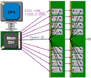 DDR2在DDR的基礎(chǔ)上將芯片接口時(shí)鐘頻率提高一倍并將工作電壓從2.5V降低至1.8V,從而使其能在相對(duì)更低的功耗下獲得更高的傳輸速率。一般情況下,DDR2的輸入時(shí)鐘頻率覆蓋200/266/333/400/533MHz,傳輸比特率覆蓋400/533/667/800/1066Mb/s/pin。相對(duì)于DDR,由于速度的提升,DDR2在主板設(shè)計(jì)要求上也有所變化。內(nèi)存控制器每Channel可級(jí)聯(lián)的DIMM數(shù)從DDR時(shí)期的4到8條減少至2到3條,數(shù)據(jù)線(DQ)上的終端電阻從主板上的分立電阻搬移到了DRAM芯片內(nèi)部(ODT),數(shù)據(jù)同步信號(hào)(DQS)由單端信號(hào)變?yōu)閱味嘶虿罘挚蛇x信號(hào)。DDR2主板系統(tǒng)架構(gòu)如右圖所示。