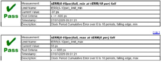 JEDEC標(biāo)準(zhǔn)要求測(cè)量n分別為2、3、4、5、6-10、11-15時(shí)tERR(n per)的最大及最小值。對(duì)于這樣的要求,如果要用手工測(cè)量將是非常耗時(shí)且低效率的。力科QPHY-DDR2軟件包的時(shí)鐘測(cè)量部分支持上述所有參數(shù)的自動(dòng)測(cè)量,僅需使用一根差分探頭將時(shí)鐘信號(hào)接入示波器即可完成所有的測(cè)量工作,測(cè)量后的所有參數(shù)結(jié)果及對(duì)應(yīng)波形將列在自動(dòng)生成的測(cè)試報(bào)告中并與JEDEC標(biāo)準(zhǔn)中門限值進(jìn)行比較。如下圖為使用QPHY-DDR2測(cè)量tERR(6-10 per)時(shí)的部分結(jié)果與對(duì)應(yīng)波形。
